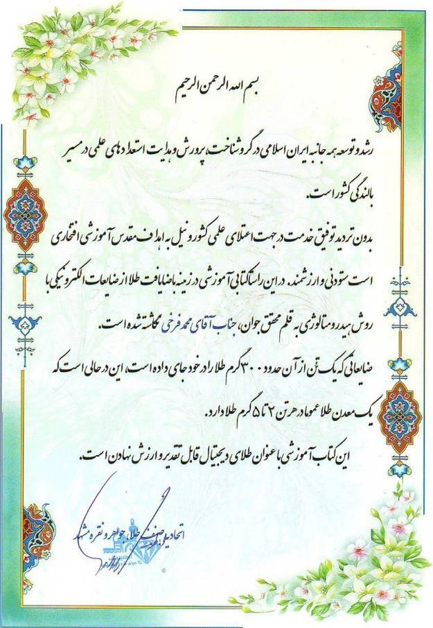 این کتاب توسط محمد فرخیمسئول آزمایشگاه قالکاری وتیزابکاری 995با 5 سال سابقه تخصصی در زمینه فراوری طلاتالیف شده است