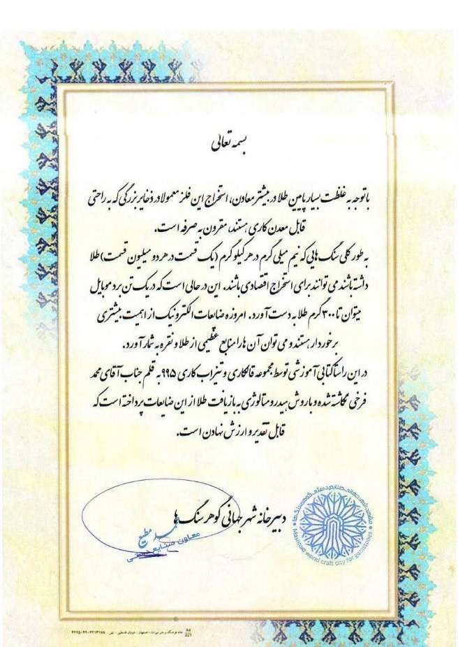 - برگزار کننده سمینار های آموزشی فراوری طلا در سطح کشور