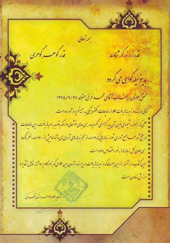 - مسئول آزمایشگاه مجموعه قالکاری و تیزاب کاری 995 با مدیریت علی فرخی در استان یزد